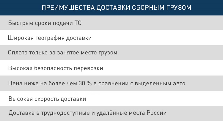 Сборной машиной перевозят грузы, которые занимают не весь кузов автомобиля (для этого доставляем отдельным авто), такие как: коробки, ящики, груз на паллетах и т.д. Доставляем легковесный груз со скидкой, например, утеплитель, который комплектуем сверху основного груза. Не кантуем груз на складах, комплектуем машину на терминале и отправляем к Вам.